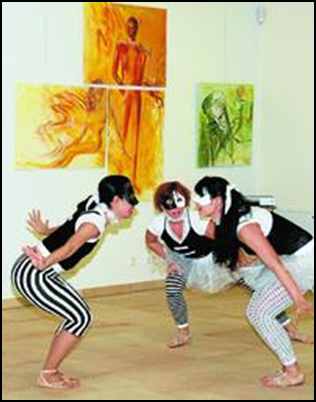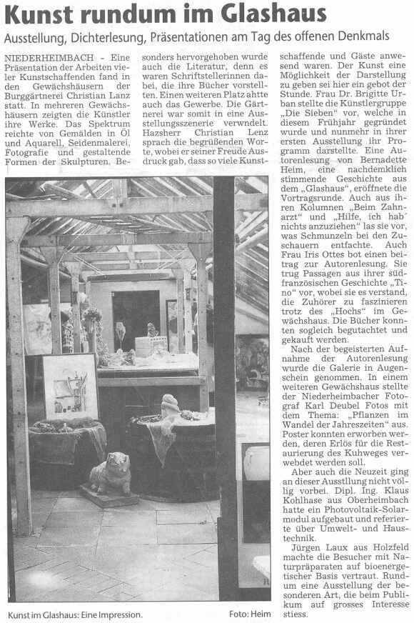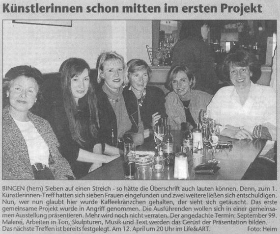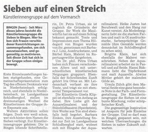 Bei der Vernissage wurde das Motto "Begegnungen" durch weitere Mitglieder des Vereins in einer gemeinsamen Aktion mit Ausdruckstanz und Literatur eindrucksvoll verknüpft. "Die Sieben" haben sich 1999 gegründet. Das Miteinander aus unterschiedlichen Kunstformen ist ein Forum, das Nahrung für künstlerische Impulse ist. Im Binger Raum sind die Aktionen "Der Sieben" ein fester Begriff. Ihre Aktivitäten hat die Stadt Bingen schon 2002 mit dem Kunstpreis honoriert. Die erste Begegnung von sieben Frauen hat den Namen des Vereins geprägt. Mit Hannelore Hilgert aus Horrweiler, der neuen Vorsitzenden der Künstlergruppe Nahe, sind es jetzt acht Frauen, die als Künstlerinnengruppe ihren kooperativen Weg gehen. Bilder von Heike Justen (Seibersbach), Claudia Bonyadi-Gittermann (Bacharach), Seidenmalerei von Ursula Zülch (Waldalgesheim) und die der Natur abgelauschten Skulpturen von Christine Rowland (Liebshausen) vertreten in der Ausstellung die Sparte Bildende Kunst.